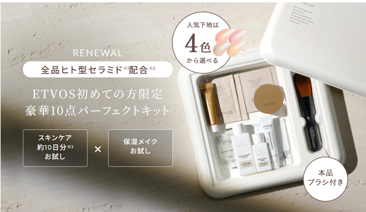 国産ミネラルファンデーションとセラミドスキンケアで人気のエトヴォスが、スキンケアもメイクも一度にお試しできるように リニューアルした豪華なスターターセット。