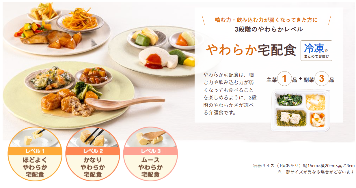 やわらかさのレベルに合わせて選べる 3つのコースがあり、栄養バランス・食べやすさ・見た目の楽しさにまでこだわった食事を、自宅まで冷凍でお届けします。