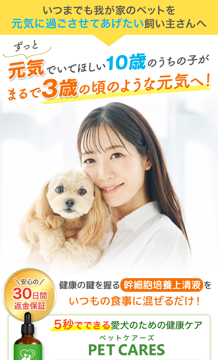 その結果、古い細胞の入れ替えが遅れ、健康維持が難しくなってしまいます。そこで登場するのが幹細胞培養上清液配合 の PET CARES(ペットケアーズ)です。。