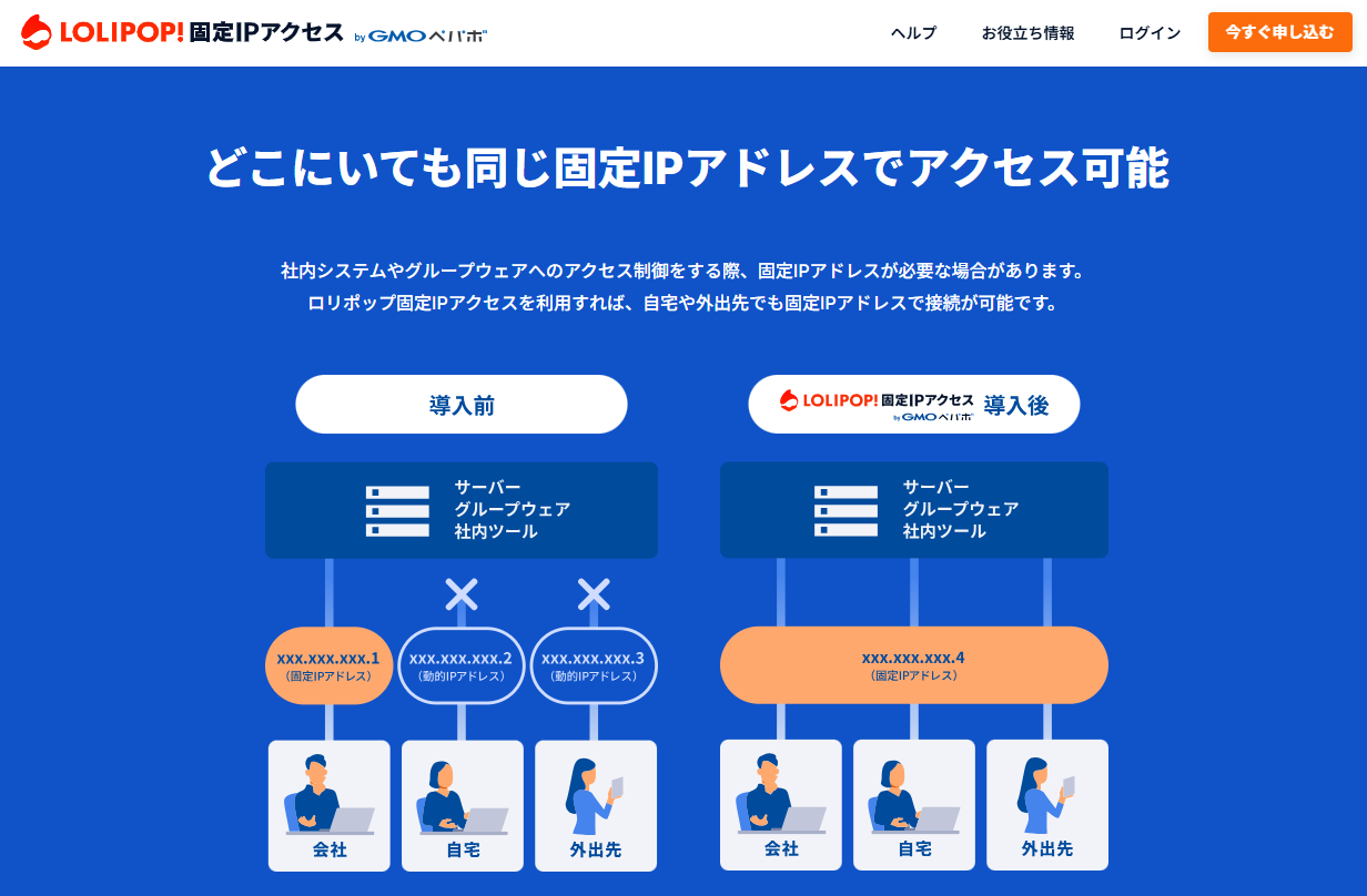 「外出先から安全にアクセスしたい」「不正アクセスを防ぎたい」 そんな方におすすめなのが、GMOペパボ株式会社が提供する『ロリポップ!固定IPアクセス』です。 なんと月額わずか 539円(税込) で、あなた専用の固定IPアドレスが使える! 低コストで高セキュリティなネット環境を手に入れられると注目を集めています。