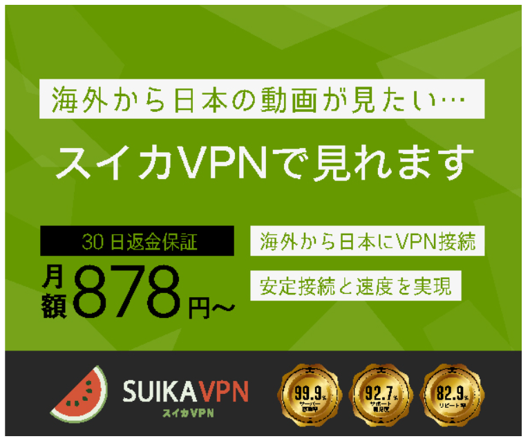 スイカVPNを利用すれば、海外にいても日本の動画配信サービス・サブスクリプションを利用可能です。